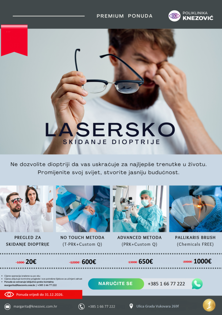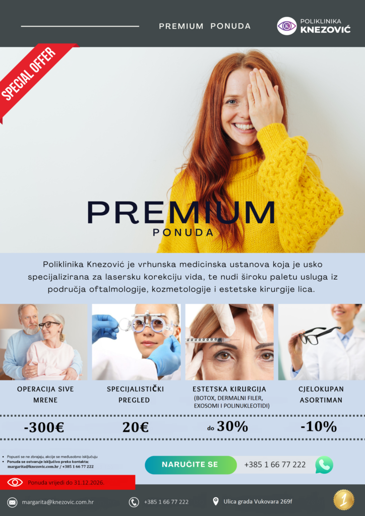 Detaljnije informacije možete potražiti na web stranici Poliklinike https://knezovic.com.hr/, a popusti se ostvaruju isključivo putem elektroničke pošte margarita@knezovic.com.hr ili pozivom na broj +385 1 66 77 222 s naglaskom da se radi o Premium ponudi.